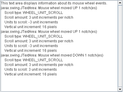 MouseWheelEventDemo This section Reports all mouse wheel events that occur within a text area to demonstrate the circumstances under which mouse wheel events are fired.