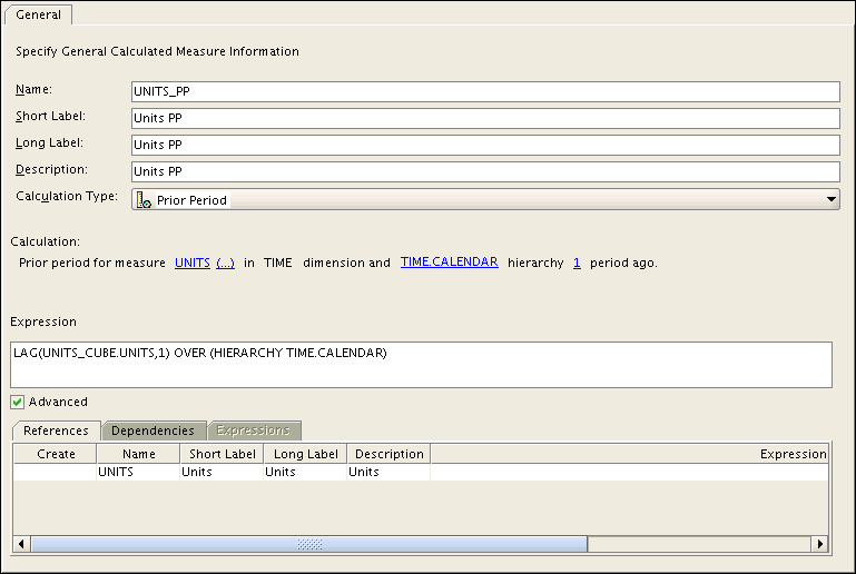 Select the Advanced option to display the References, Dependencies, and Expressions tabs. The tabs have the following information: