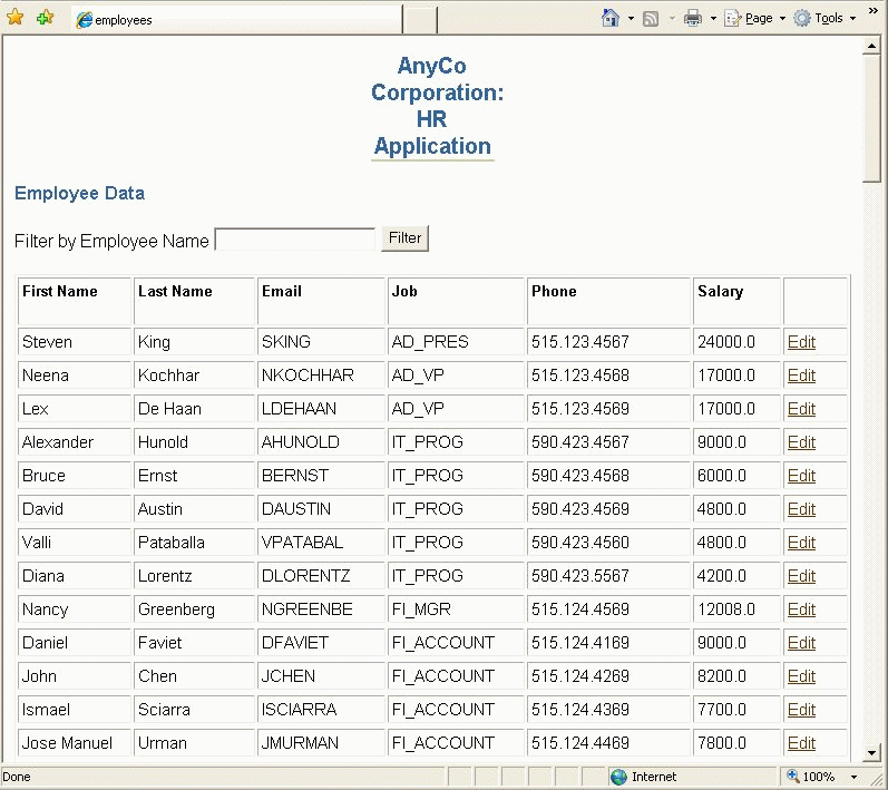 employees.jsp. Figure 5-3 shows employees.jsp when it is run and displayed in a browser, illustrating the link users can click to edit employee data.