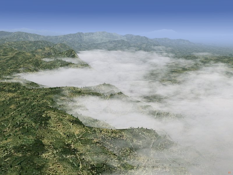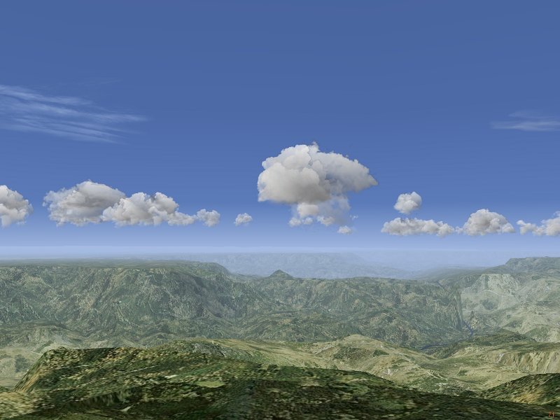 The local weather package aims to provide the functionality to simulate such local phenomena. In version 1.18, the package supplies various cloud placement algorithms, as well as local control over most major weather parameters (wind, visibility, pressure, temperature, rain, snow, thermal lift, turbulence...) through interpolation routines and effect volumes. The dynamics of the different systems is tied together - for instance clouds and weather effects drift in the specified wind field. The package also contains a fairly detailed algorithm to generate convective clouds and thermals with a realistic distribution over the various terrain types. There is a simulation of the interaction of the convective cloud system with the terrain as a function of time. Clouds drifting in the wind flow over obstacles, i.e. they change their altitude dynamically. Convection is implemented with a life cycle model of Cumulus clouds - they are generated, evolve for a given lifetime dependent on the underlying terrain and decay at the end of their life cycle. Thermals associated with the clouds follow the same pattern. In particular, in the presence of wind favourable spots for convection generate 'alleys' of dense cloud cover downwind, or thermals and clouds generated over land decay rapidly once they reach open water.