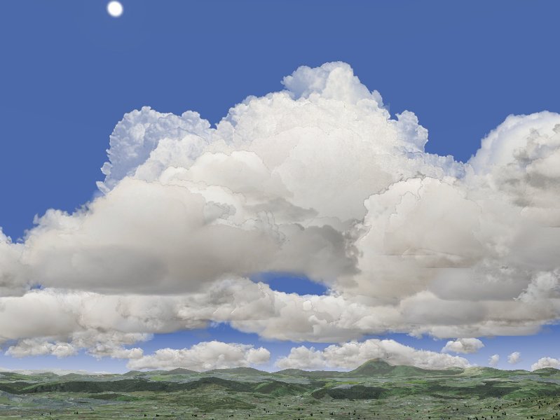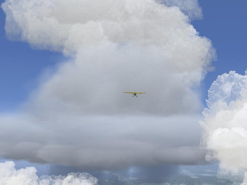 More complex clouds are rendered in sandwitched layers of several different textures. An example are Cumulonimbus towers, which use diffuse textures on the bottom, changing to more structured textures in the upper part of the cloud. With up to 2000 cloudlets, skies with multiple thunderstorms may not render with sufficient framerates on every system.