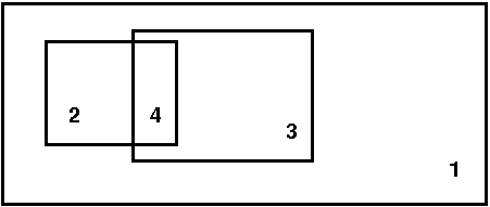 Volumes 2 and 3 are nested inside volume 1, therefore all settings of 2 overwrite those of 1 when 2 is entered and are restored to 1 when region 2 is left directly into 1. Region 4 is a chain, and as such ill defined: When one leaves 2 into 4, the settings of volume 3 are used (because later definitions overwrite earlier ones). When one now leaves 4 into 3 (and hence leaves 2), it would be wrong to restore to the values on entry of 2 (i.e. the properties of 1), as 3 is still active. But the active volume count has changed, so leaving 4 into 3 does not lead to any changes. The reason why 4 is still ill-defined is that what weather is encountered in 4 depends on the direction from which it is entered - when it is entered from 2, it has the properties of 3, whereas when it is entered from 3, it has the properties of 2.