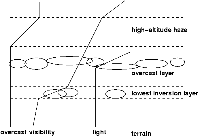 The meaning of these parameters is as follows: Visibility is linearly interpolated in altitude between several altitudes: the ground value is given in the weather station call. vis_aloft determines the visibility after passing the lowest inversion layer (i.e. usually the lowest cloud layer altitude) where the visibility suddenly increases. The altitude of the transition is given by vis_alt_aloft. The visibility higher up is determined by high-altitude haze, i.e. it takes the value vis_overcast at the position overcast_alt_high (the upper edge of the haze layer) and increases with constant rate from there. The amount of high-altitude haze is given by overcase, a number between 0 and 1, and the position of the layer is determined by overcast_alt_low and overcast_alt_high. Above the second value, the skydome is no longer coloured. Finally, scattering determines the amount of light reaching the surface (between 0 and 1, reasonable values range from 0.5 to 1) and the following altitudes specify where the layers casting shadow are found - there is always the full amount of light available above scattering_alt_high. See the appendix for details of the model.