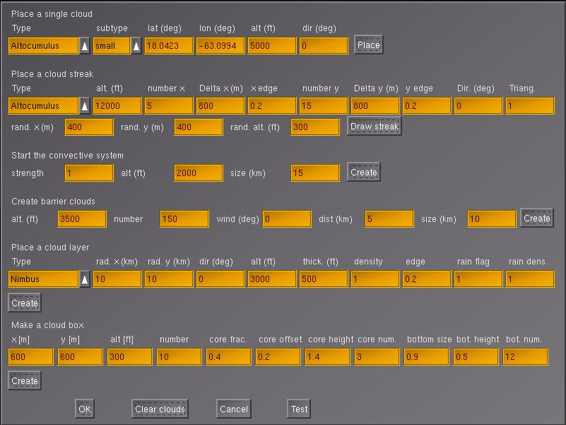 The menu item Debug/Local Weather (Test) contains the low level cloud placement functions. Its purpose is mainly for developing cloud patterns without having to resort to re-type the underlying Nasal code every time. Currently five options are supported: Place a single cloud, Place a cloud streak, Start the convective system, Create barrier clouds , Place a cloud layer and Make a cloudbox.