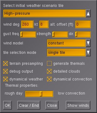 The slider Thermal properties is mainly relevant for soaring scenarios. It governs the rato of maximum lift to radius of a thermal. A setting close to low convection creates large thermals with relatively small lift and virtually no turbulence, a setting close to rough day creates very narrow, turbulent thermals with large lift. However, it also affects the Cumulus textures to be used. low convection creates well-formed, smooth Cumuli whereas rough day biases the texture selection towards more rugged and diffuse clouds.