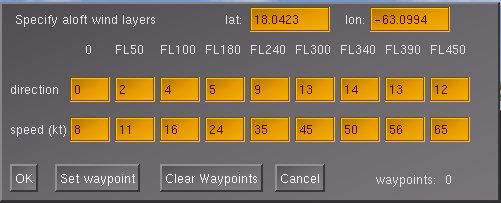 For aloft interpolated, the menu is used by inserting wind direction and speed for all given altitudes. After OK, the specified values are used. For aloft waypoints, the same info must be supplied for a series of waypoints. First, the latitude and longitude has to be inserted, afterwards the aloft winds for that point below. The button Set waypoint commits the windfield as specified in the menu for this position into memory. For orientation, the number of points inserted is counted on the lower right. Clear Waypoints removes all information entered so far. Note that OK does not commit the data for a waypoint. Entering a windfield in this way by hand is rather cumbersome, but may be useful occasionally - the main purpose of the wind model however is to work with live weather data.
