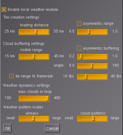 The next option controls the amout of resources allocated to making clouds drift in the wind if dynamical weather is on. In order to avoid freezes, the weather dynamics system processes only a fixed number of clouds per frame inside the field of view. That means that faraway clouds do not necessarily move even with dynamical weather on. The slider indirectly controls the distance out to which clouds are being processed.