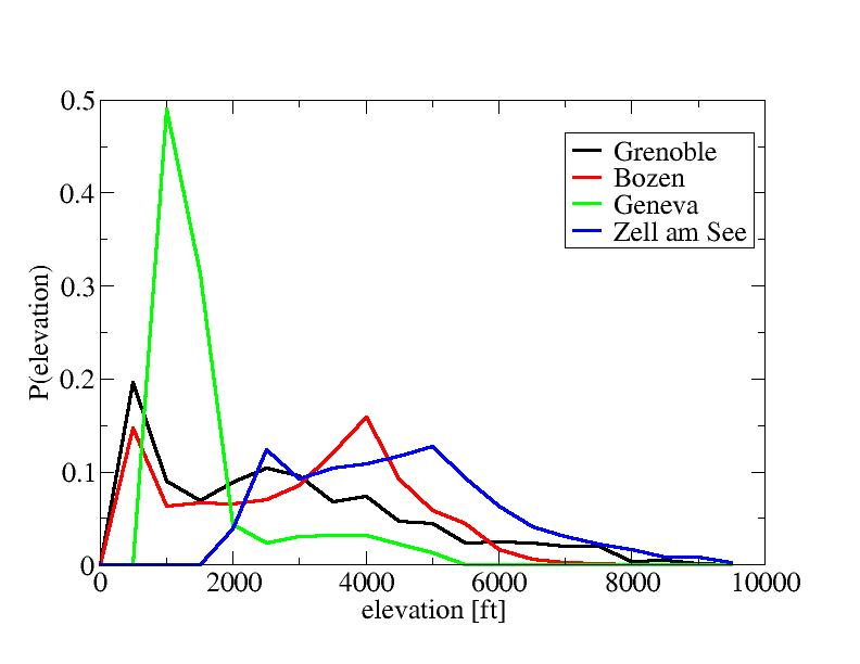 For instance, the terrain around Geneva is mostly flat around 1000 ft (where the peak of the distribution lies) with some mountains up to 4500 ft nearby. Based on such distributions, the algorithm next determines the minimum altitude alt_min, the maximum altitude alt_max, the altitude below which 20% of the terrain are found alt_20 and the median altitude below which 50% of the terrain are found alt_med.