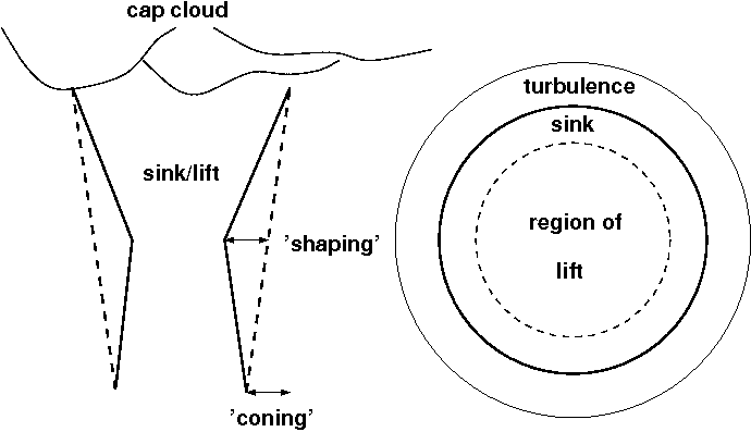 Vertically, is is characterized in addition to height and radius by two parameters, 'coning' and 'shaping', which make it cone-shaped and wasp-waisted. From zero to 200 m above ground, the lift is smoothly fading in, above the cloudbase it is smoothly faded out to zero at 10% above the nominal altitude. Horizontally, there is an outer ring where the air becomes turbulent, followed by a region of sink which in turn is followed by the inner core of lift.