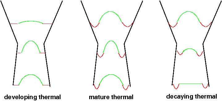 In a young thermal, lift starts to develop from the ground, sink is initially absent. When the lift reaches the cloudbase, sink starts to develop from the ground and rises up as well. Only in a mature thermal are sink and lift in equilibrium. When the thermal starts to decay, lift initially decays from the ground upward, till it reaches the cloudbase. At this time the cap cloud dissolves. For a time there is a residual distribution of sink decaying from bottom to top till the thermal evolution is over and the thermal (and the associate turbulence field) is removed.