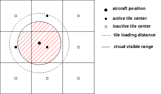 The first part controls the creation of new weather tiles, the second part controls the ranges up to which clouds inside a generated weather tile are shown as part of the scenery (clouds created but not shown are stored and processed in a buffer array). Clouds are visible if and only if they are 1) part of a created tile and 2) closer than the buffering range. This is illustrated in the following figure: Tiles are only created if their center is within range, clouds are only visible if the cloud model itself is within range, the resulting region dependent on the two ranges in which clouds are displayed is shown in red.