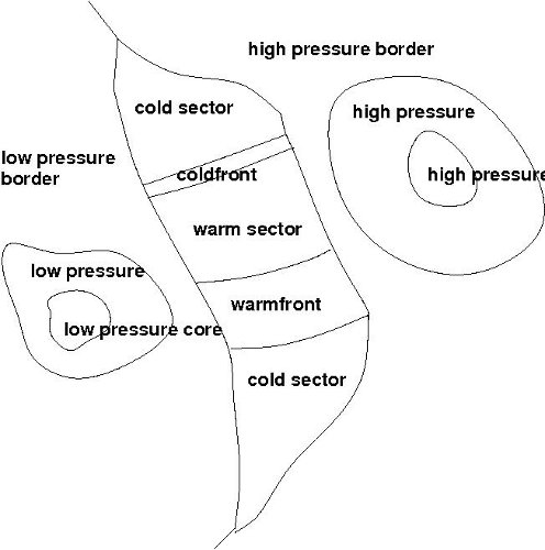 Weather tiles are classified chiefly by air pressure. What is currently in the models are three classes for a low pressure system, four different classes for the system of weather fronts and airmasses spiralling into the low pressure system and three classes for a hugh pressure system. The general rule is that low pressure tiles contain layered clouds, overcast skies and rain whereas the high pressure tiles contain clear skies and few convective clouds. The topology assumed for the weather system is apparent in the following diagram:
