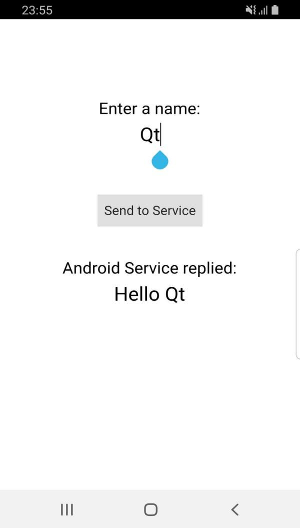 When clicking the Send to Service button, the name entered in the QML view, Qt, in this case, is sent to the Android service. Then, the service replies back with a message Hello Qt which is printed in the QML view.