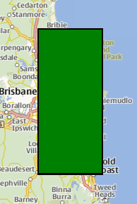 The following snippet shows a map containing a MapRectangle, spanning from (-27, 153) to (-28, 153.5), near Brisbane, Australia. The rectangle is filled in green, with a 2 pixel black border.