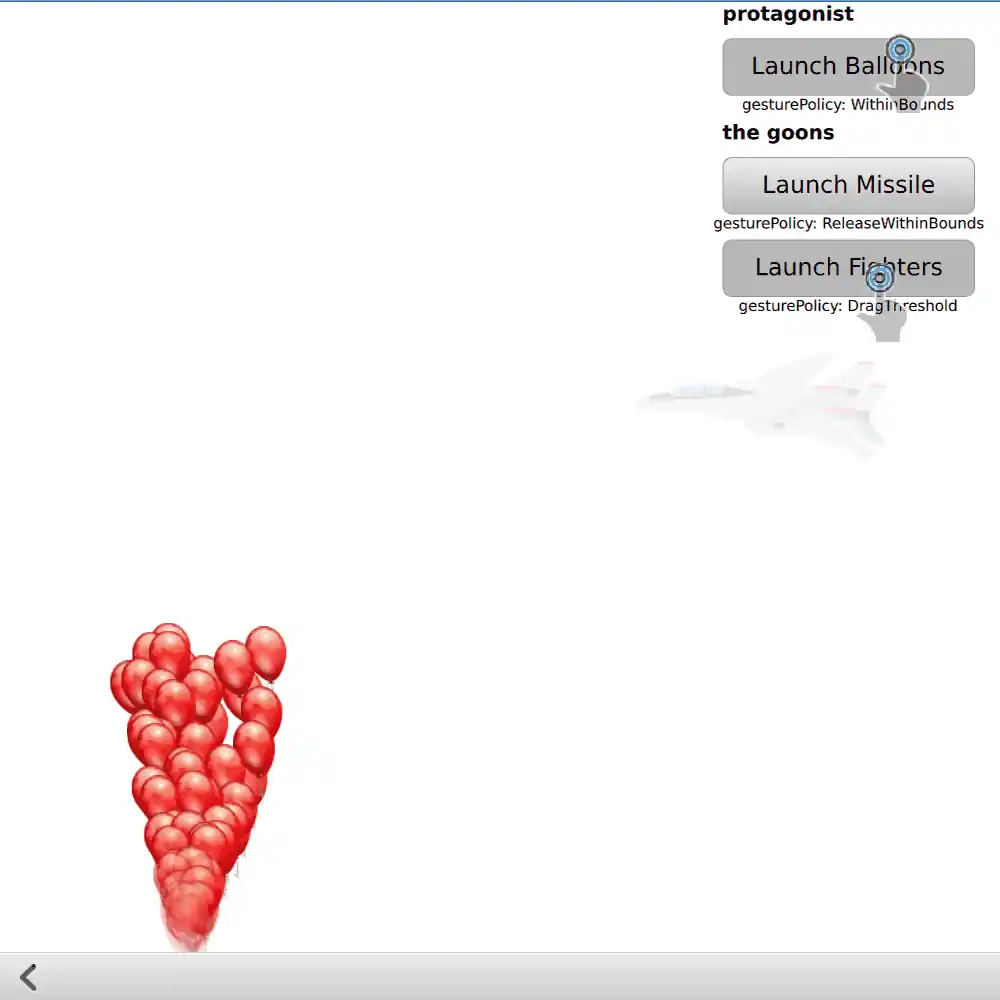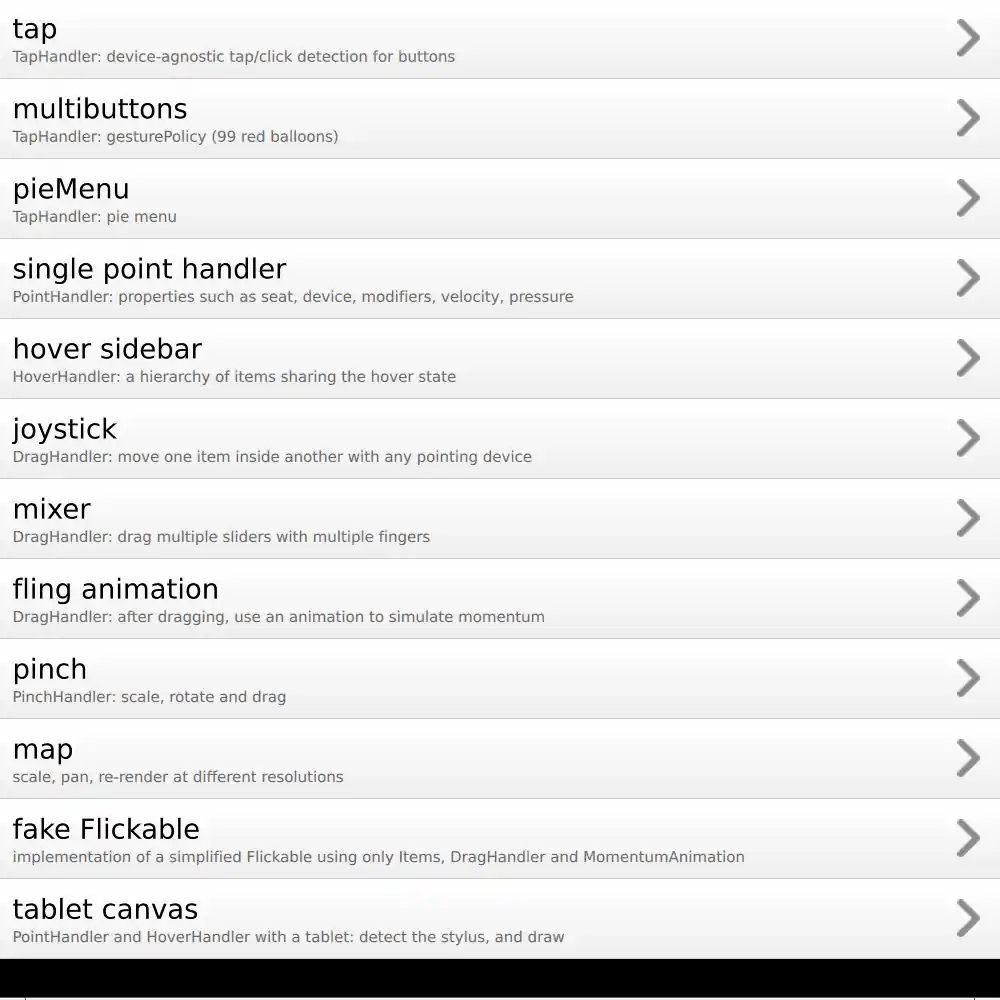 If you build the example as an executable, you can choose pages from a top-level ListView. The TouchpointFeedbackSprite and MouseFeedbackSprite components show how to use PointHandler to provide feedback about what the user is doing with the pointing devices: these components are always visible throughout the example, and do not interfere with interaction anywhere else. These components are handy for reuse if you ever need to do a video or live demonstration of a user interface.