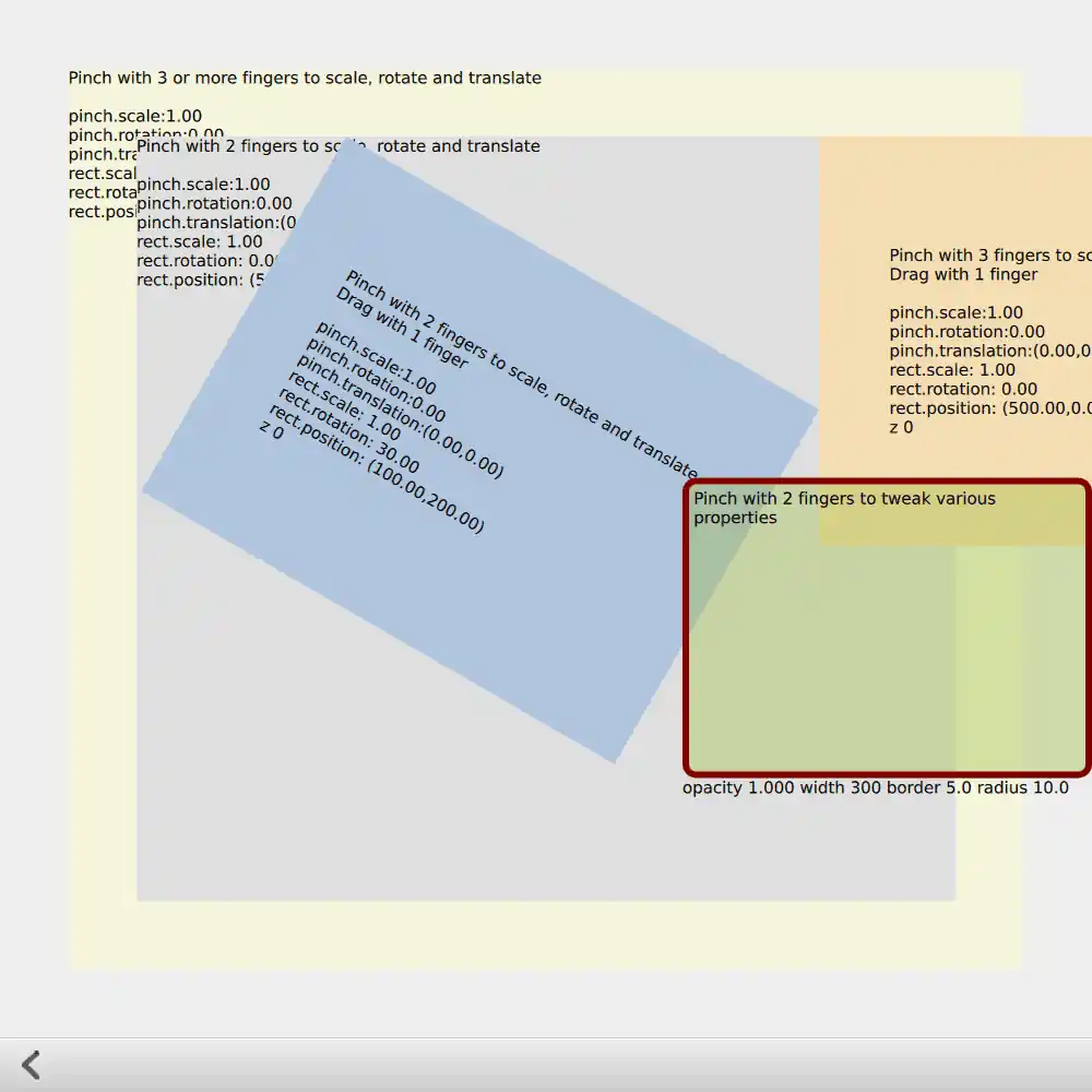 The "pinch" page demonstrates multiple PinchHandlers: some require two fingers and some require three, to perform the usual scaling, rotation and translation, with constraints managed via PinchHandler's axis min and max properties. One of the PinchHandler instances is used to manipulate different Rectangle properties rather than position, scale and rotation. Various PinchHandler properties are bound in various ways. You should be able to manipulate each instance uniquely. Some items also have DragHandlers and TapHandlers.