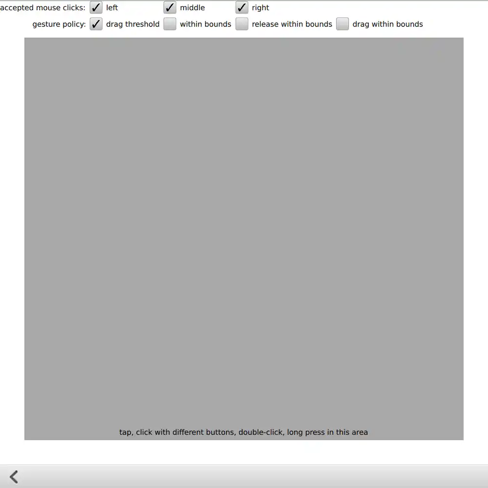 The "tap" page shows how to detect touchscreen taps, long-presses, and mouse clicks with different buttons. You can also try out the different gesturePolicy values.