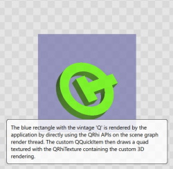 This example shows how to implement an item that performs cross-platform, portable 3D rendering into a texture using the QRhi APIs and then displays that image.