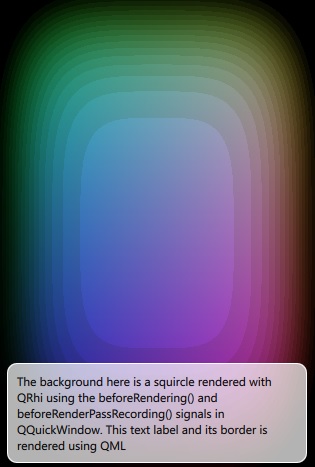 The custom rendering is encapsulated within a custom QQuickItem. RhiSquircle derives from QQuickItem, and is exposed to QML (note the QML_ELEMENT). The QML scene instantiates RhiSquircle. Note however that this is not a visual item: the QQuickItem::ItemHasContents flag is not set. Thus the item's position and size has no relevance and it does not reimplement updatePaintNode().