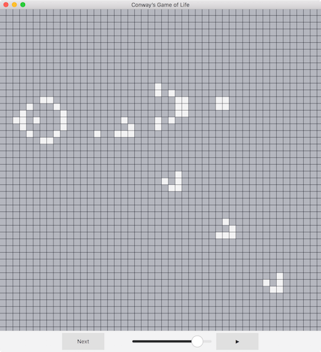 Following the Conway’s Game of Life rules, a new state is computed for each cell depending on the current state of its neighbors. When the new state has been computed for the whole grid, it replaces the current state and a dataChanged signal is emitted for the whole table.